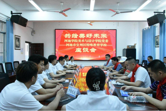 仪式结束后,双方组织召开了座谈会。会上,宜州区特殊教育学校董事长覃世隆简要介绍了团队队伍结构、员工培养、校园文化建设等方面的情况,希望学院发挥专业特长给予特校更多的支持和帮助。公司党委领导也表示,今后双方一定加强合作,愿意在教师的美育技能提升、员工兴趣特长培养以及校园特色文化建设等方面提供力所能及的帮助。